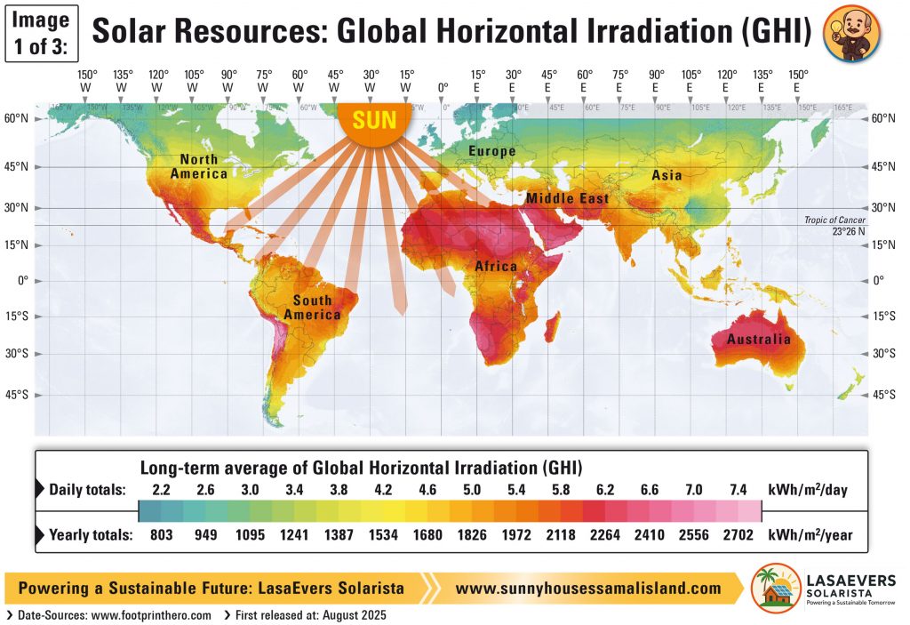 Thank you for the intriguing question and the image. I’ve reviewed the solar radiation map you’ve shared, and you’re absolutely right—regions at similar latitudes (like northern Australia vs. South America or California vs. Florida) often show surprisingly different levels of solar irradiance.